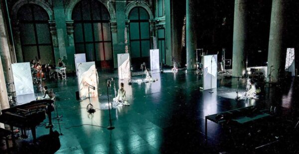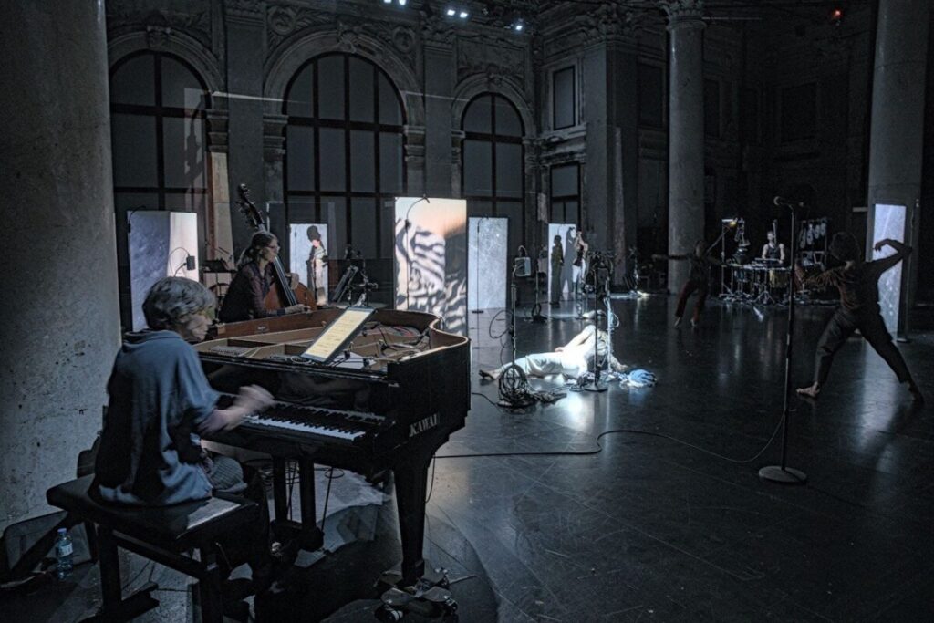 Die Musik spielt einen ahnungsvollen Soundtrack, komponiert in antizipierter Retrospektive. Die fünf Mitglieder von PHACE, Manuel Alcaraz Clemente (Schlagwerk), Alexandra Dienz (Kontrabass), Mathilde Hoursiangou (Klavier/ Keyboard), Walter Seebacher (Klarinette(n)) und Roland Schueler (Cello), jeder von ihnen meisterhaft auf seinem/ihrem Instrument, spielen zeitgenössische Kompositionen von Simon Steen Andersen, Alessandro Baticci, Jérôme Combier, François Sarhan, Agata Zubel und Andreas Berger. Letzterer, Haus- uns Hof-Sounddesigner und Gründungsmitglied von Liquid Loft, gießt seinen elektronischen Sound wirkungsvoll in das Gefäß aus tonalen Phrasen und zeitgenössischem Duktus folgenden Alternativen bei der Klangerzeugung mit klassischen Instrumenten. Es kratzt und kracht, scheppert und wimmert, brummt und kreischt. Solistisch oder gemeinsam holen sie aus ihren Instrumenten – neben dem Sauberen – Neues heraus. Die resultierenden Klangereignisse fahren einem in die Glieder (Künstlerische Leitung: Reinhard Fuchs), unterstützt von Licht Design und Scenografie von Thomas Jelinek. Der macht aus der Säulenhalle mal einen wunderschönen, dann einen Ort des Zerfalls. Jedenfalls ist ihm eine Räume und Atmosphären schaffende Bespielung dieses Theaters gelungen.