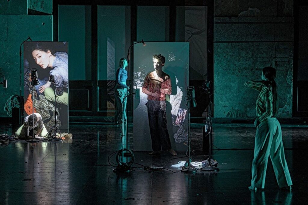 Den ersten hat der Cellist Roland Schueler, der mitten unter den ZuschauerInnen platziert die Arie der Königin der Nacht aus Mozarts „Zauberflöte“ mit ihren so berühmten Koloraturen singt, intonierend gestützt von einem Vocoder und eingebettet in elektronischen, verfremdenden Sound. „Die Hölle Rache kocht in meinem Herzen. Tod und Verzweiflung flammet um mich her!“ Die acht Tänzerinnen und Tänzer auf der Bühne drapieren Kleidungsstücke für die Live-Projektion auf ihre Videowand. Die Musik dazu, ein apokalyptisches Klang-Gemenge aus live gespielten Natur-Instrumenten und elektronisch erzeugtem Sound, macht die PerformerInnen zu Archäologen ihres eigenen Lebens.